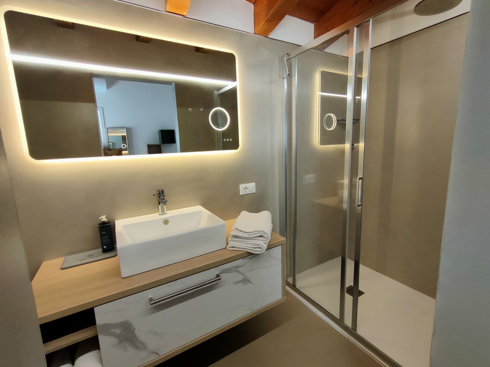 Camera accogliente, silenziosa e confortevole con arredamento moderno di ampie dimensioni dotata di angolo cottura con 2 fuochi, lavello, frigorifero e microonde. Dispone di aria condizionata, sofà, terrazzo, TV-sat e WiFi. La sala da bagno a tre elementi e box doccia, è dotata di cestino, phon, specchio per il trucco, porta asciugamani, dispenser per sapone e shampoo/doccia.